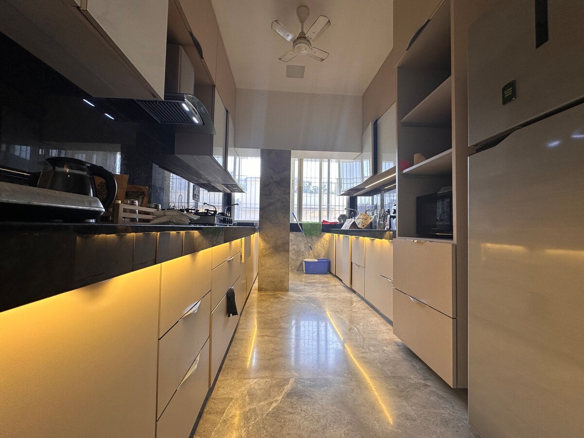 Véritable charmant appartement spacieux de 3 chambres en plein cœur de la banlieue chic de Mumbai. À deux pas de la rue commerçante haut de gamme de la ville, Linking Rd. À 5 minutes de Bandra, permettant un accès facile aux endroits les plus animés de la ville. Baignée d'une riche lumière du soleil, la maison dispose d'intérieurs modernes, ce qui rend chaleureux et agréable à la maison. La cuisine est remarquable ! Soyez prêt à être impressionné par nos salles de bain ; c'est comme une journée au spa enveloppée dans du marbre ! Assurez-vous que votre séjour est aussi confortable et élégant que possible.