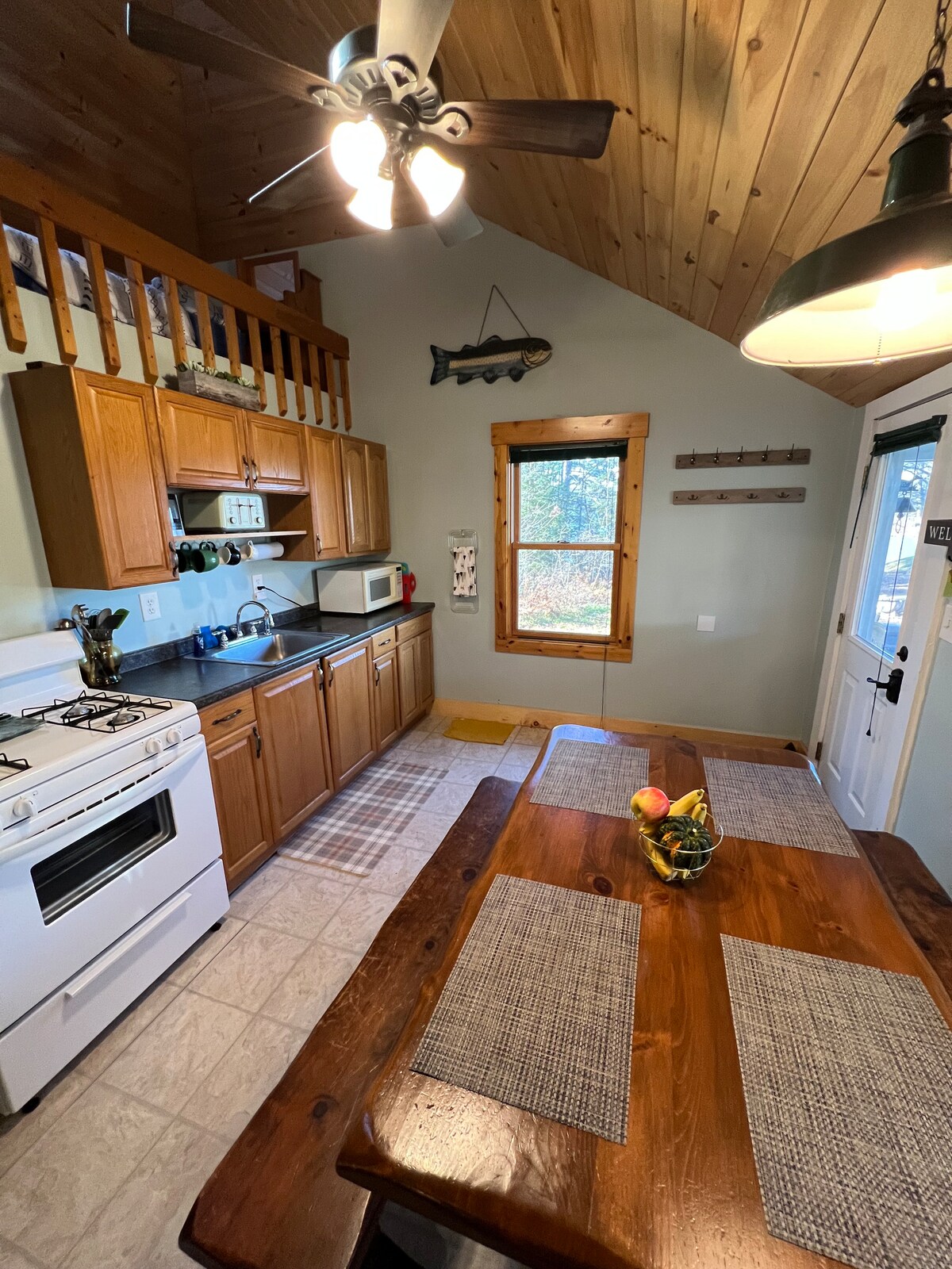 Cabane confortable au bord du lac, foyer, randonnée, mont White, kayak, pêche