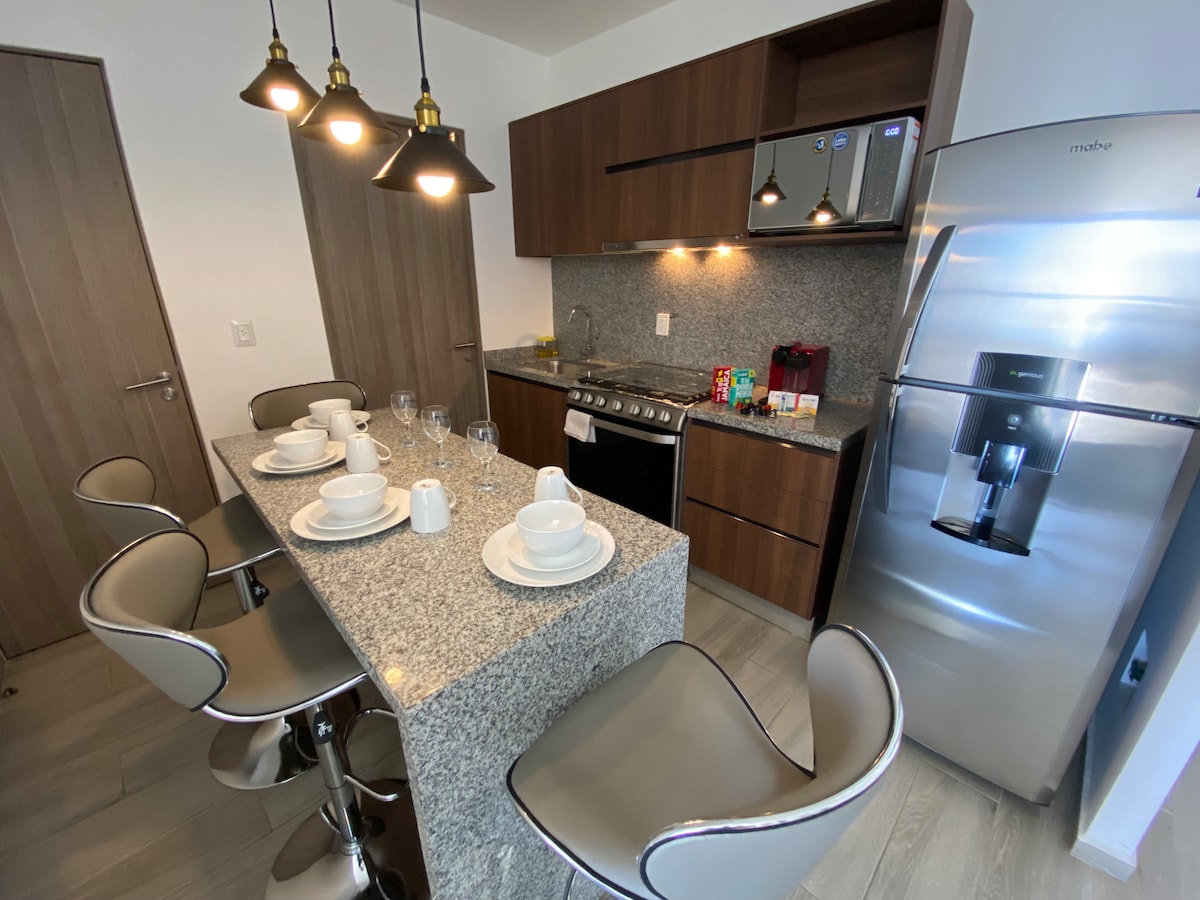 Bienvenue dans votre retraite de luxe au cœur du Querétaro moderne ! Ce charmant appartement offre confort et style dans un emplacement de choix. Cuisine entièrement équipée et salon confortable avec télévision HD. Une connexion Wi-Fi haut débit et un service client dédié sont disponibles à tout moment. Pour votre commodité, nous avons une mini-climatisation dans notre appartement, ce qui en fait l'endroit idéal pour séjourner. Réservez dès maintenant et faites de votre voyage une expérience inoubliable !
