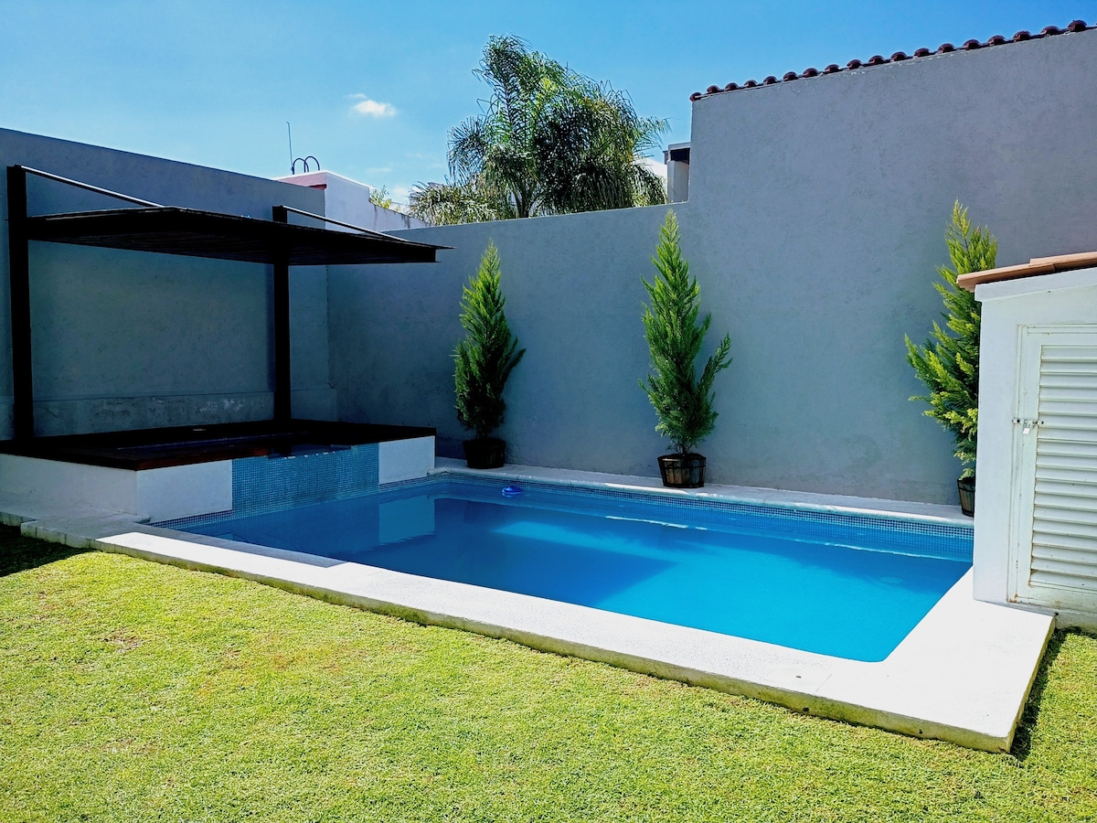 Détendez-vous dans cet espace calme et élégant, plein de vie avec son beau jardin, son jacuzzi relaxant, la télévision spectaculaire de 75 pouces dans le salon, pour regarder vos films et séries préférés. Il est également très bien situé pour profiter pleinement de Tequisquiapan et de ses environs, tels que ses fromageries, ses vignobles, sa montgolfière, ses quads, ses chevaux, ses restaurants, ses bars et ses visites. Ne manquez pas de visiter la Peña de Bernal, les mines d'opale, etc.