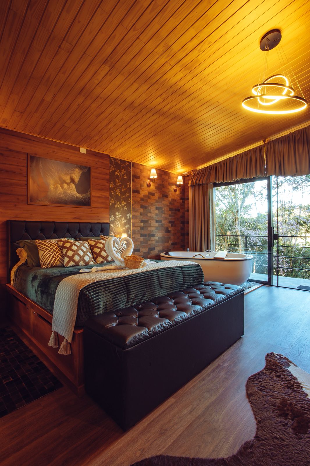 Le chalet Luar da Montanha offre une expérience vraiment unique avec une touche de sophistication. L'une de ses plus grandes attractions est la vue sur les montagnes lointaines accompagnée d'un magnifique coucher de soleil et à côté de la forêt indigène. Son espace extérieur dispose d'un balcon et d'un garage, tandis que son espace intérieur offre un lit king size, une télévision de 32 pouces (Sky), un délicieux jacuzzi (double), le tout avec une vue panoramique sur la forêt et les montagnes. Il contient une cuisine complète et équipée, et une table d'appoint dans la chambre et sur le balcon.