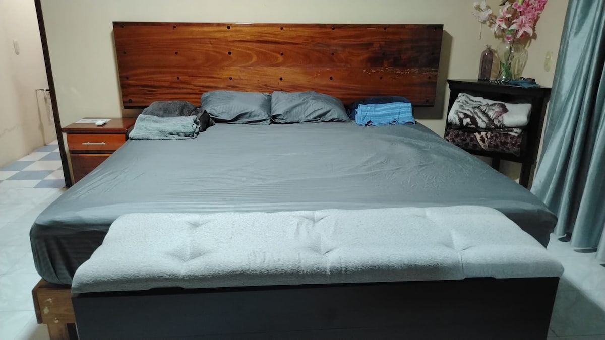 Profitez de notre maison confortable, de sa grande cour et de son excellent emplacement dans le centre de Juchitan. Dans une ambiance calme et familiale. Idéal pour les couples et les amateurs de nature et d'architecture mexicaine. Il dispose d'une salle de bains privative dans la chambre, d'un salon avec télévision et bureau, d'une petite cuisine avec réfrigérateur et poêle et d'un beau couloir traditionnel avec vue sur la cour. Vous pouvez garer votre véhicule à l'intérieur de la propriété. Il partage la cour avec notre maison familiale.