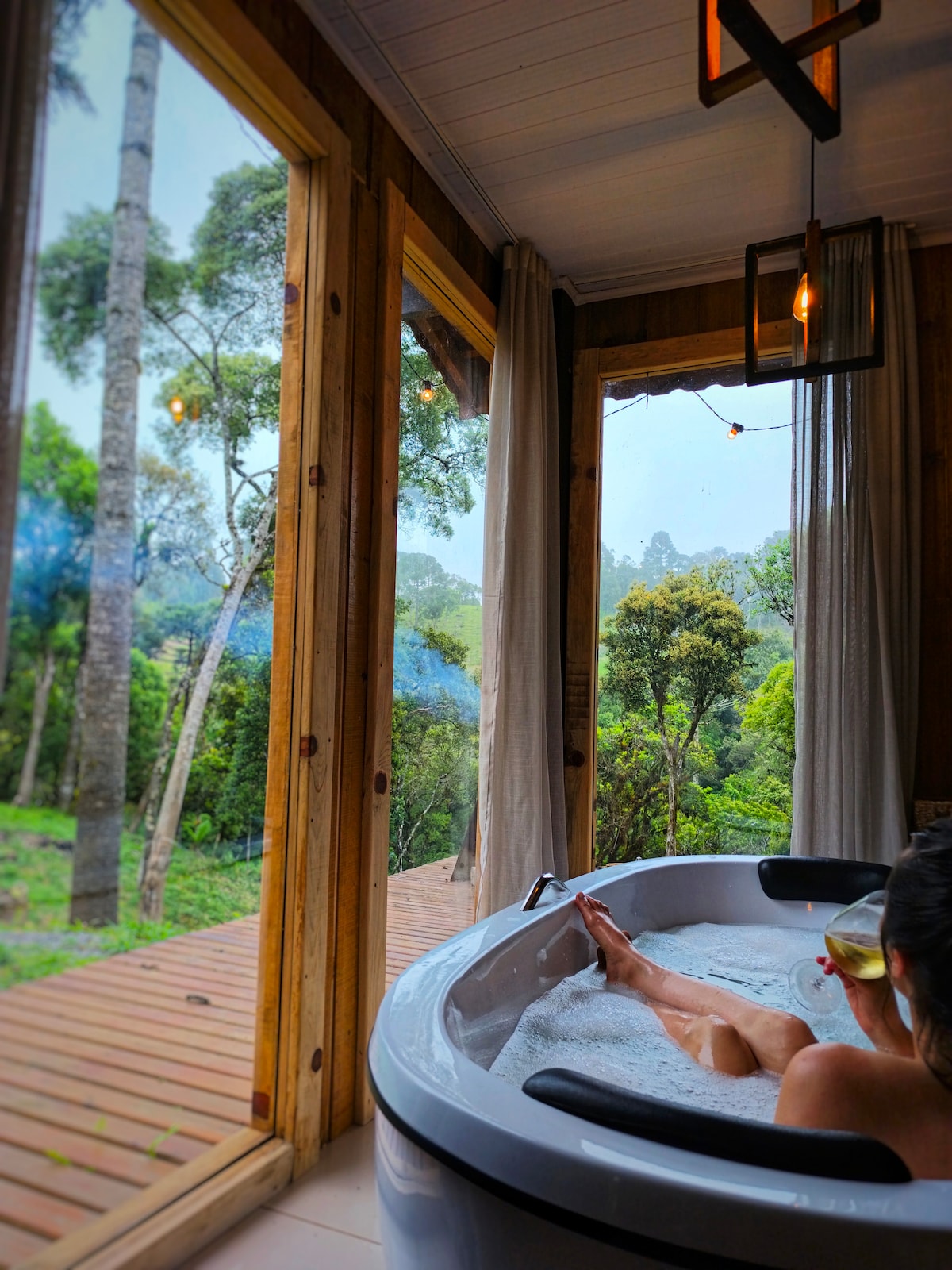 Nos huttes ont été soigneusement conçues pour fournir un sentiment de connexion à la nature et au confort en même temps. Chaque chalet a une particularité, ce qui vous amène à apprécier le vert de la forêt, le bruit du ruisseau et le chant des oiseaux, même de l'intérieur des chalets. Vous pourrez profiter de la chaleur de la cheminée, accompagnée d'un verre de vin ou d'un bain relaxant dans le jacuzzi.