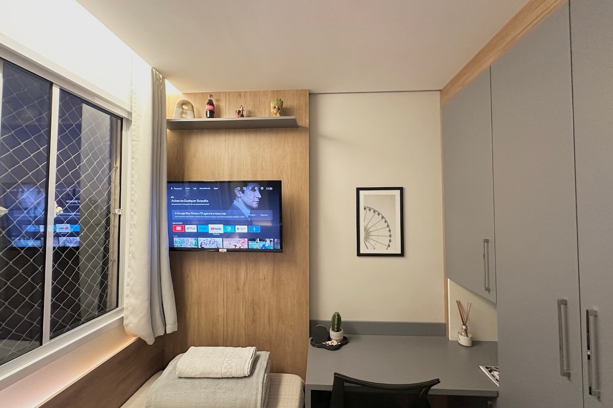 Studio équipé avec vue (23 m2 - 19e étage). Apto est à côté de la station de métro Brooklin, et à 12 minutes en voiture de l'aéroport de Congonhas. >> À proximité des lieux : . Hípica Paulista . Clínica Einstein . Consulat américain >> Centres commerciaux à proximité : Morumbi Mall . Shopping D&D . Shopping à Ibirapuera . Shopping JK Iguatemi >> Vous aurez dans le condo : Réception 24h/24 et 7j/7 ; . Salle de sport ; . Buanderie OMO ; . Coworking