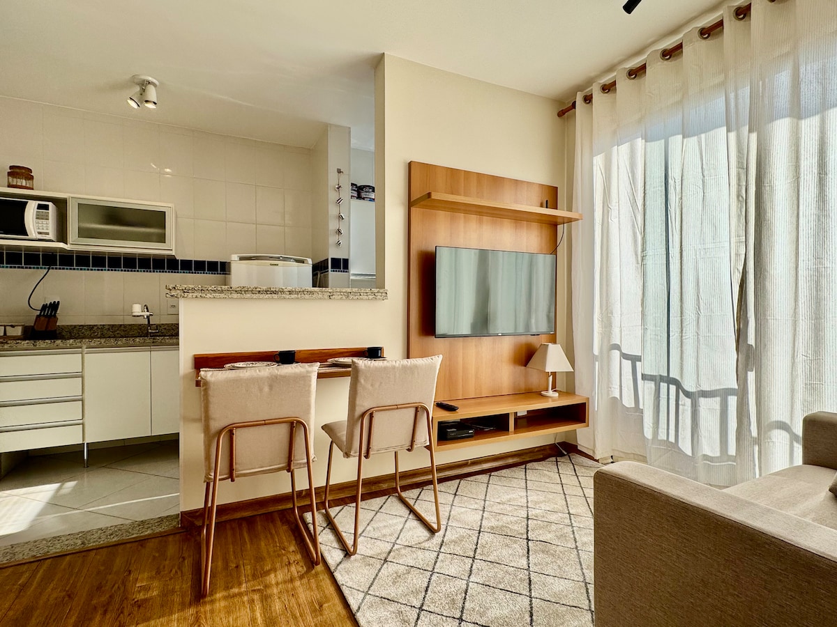 Si vous venez à São Carlos pour le travail, les études ou un traitement médical, notre appartement a été spécialement conçu pour offrir confort, praticité et tranquillité tout au long de votre séjour. 2 chambres confortables, 2 salles de bain, un salon et une cuisine complète, avec tout le nécessaire pour la vie quotidienne. Ascenseur et garage couvert exclusif. Situé dans une rue calme, l'appartement est stratégiquement situé à quelques mètres d'Embrapa, USP (Campus 1), Praça XV, Santa Casa, des cliniques et des cabinets médicaux.