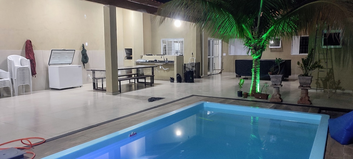 Maison confortable et calme, équipée d'un barbecue et d'une piscine avec tourbillon pour se détendre pendant votre séjour. Il est situé près du centre commercial North City, lieu très calme et organisé. Déjà avec tout ce dont vous avez besoin pour cuisiner, prendre une douche et vous reposer. 1 chambre avec un lit double et une autre chambre avec 1 lit double et 1 lit simple. Il y a 2 matelas simples de plus. Il dispose de la climatisation dans les chambres.