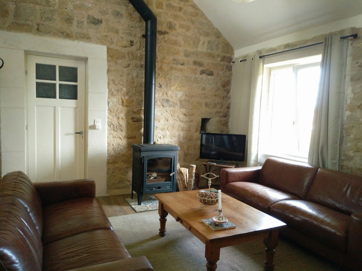 Mooie woonruimte, waar ooit de hooizolder van onze 'grange' was, met aparte slaapkamer boven de voormalige paardenstal (en waar nu de stalen rossen staan) met bed van 160 x 200 en een mezzanine (via steile molenaarstrap) met bed van 140 x 200. Houtkachel om de woonkamer en keuken mee te verwarmen. Privétuin met terras en daarnaast vrije toegang tot het terrein van de grange met jeu-de-boulesbaan, trampoline en ping-pongtafel. Verse groenten uit de moestuin volgens het seizoen.