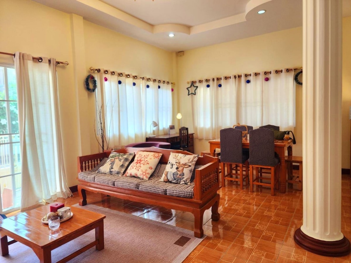 Grande maison avec 2 chambres, 2 salles de bain, 1 salon avec un hall de séjour, 1 cuisine pour cuisiner, parking privé. Nous sommes très bien situés à proximité du marché, du supermarché Big C et d'une école internationale. 📍 Aéroport de Chiang Mai, 18 minutes 📍 Central Festival, à 15 minutes 📍 Nimman 20 minutes 📍 Bazar de nuit de Chiang Mai, 20 minutes