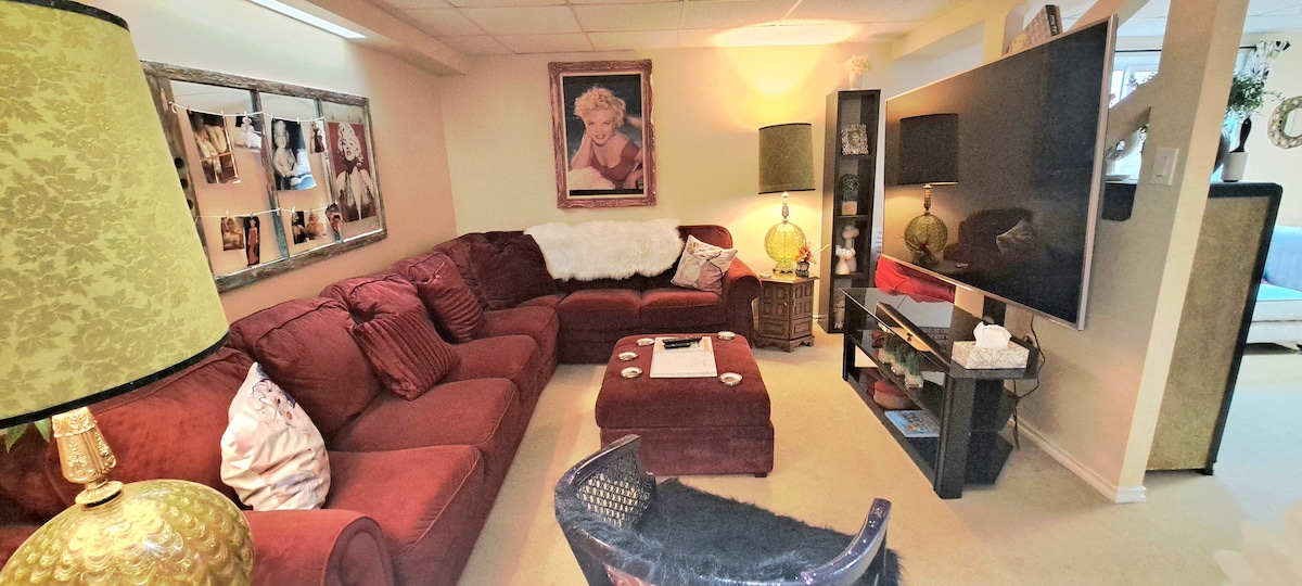 *AUCUNE RÉSERVATION PAR UN TIERS* VOUS DEVEZ ENREGISTRER TOUS LES INVITÉS ET ANIMAUX DE COMPAGNIE POUR LA NUIT. FRAIS POUR LES ANIMAUX DE 50 $. Suite au sous-sol avec insonorisation étendue, comprenant deux chambres avec lits doubles, commodes, placards avec cintres et fenêtres de sortie. La cuisine dispose de la plupart des choses dont vous auriez besoin, voir les photos. Table de cuisine avec des chaises pour quatre personnes. Barbecue au gaz naturel fourni sur demande. La salle de bain comprend des serviettes, un sèche-cheveux, un fer à repasser et des articles de toilette. Le séjour dispose d'un canapé convertible, de chaises et d'un bureau, d'une télévision connectée LG 34" avec Prime.