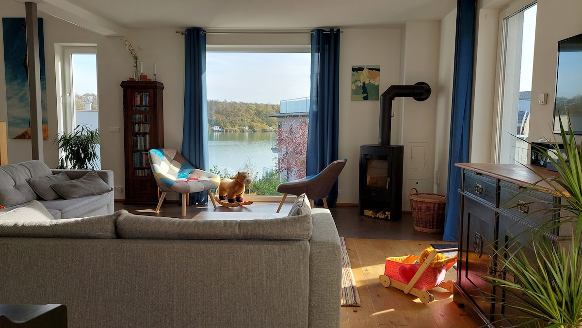 La maison de vacances a 160 m² de surface habitable et 5 chambres pour 10 plus 2 personnes. Elle est située au milieu du Neuseenland de Leipzig sur le lac Hainer, à 20 km au sud de Leipzig. La pièce maîtresse de la maison est une salle à manger/salon de 70 m² avec d'immenses fenêtres, une longue table à manger et un poêle. Il y a deux grandes terrasses, de la plus haute on a une vue sur le lac. La maison a été conçue délibérément pour les journées conviviales en grand cercle. Pour les enfants, il y a beaucoup de livres, des jouets et un plancher de jeu.