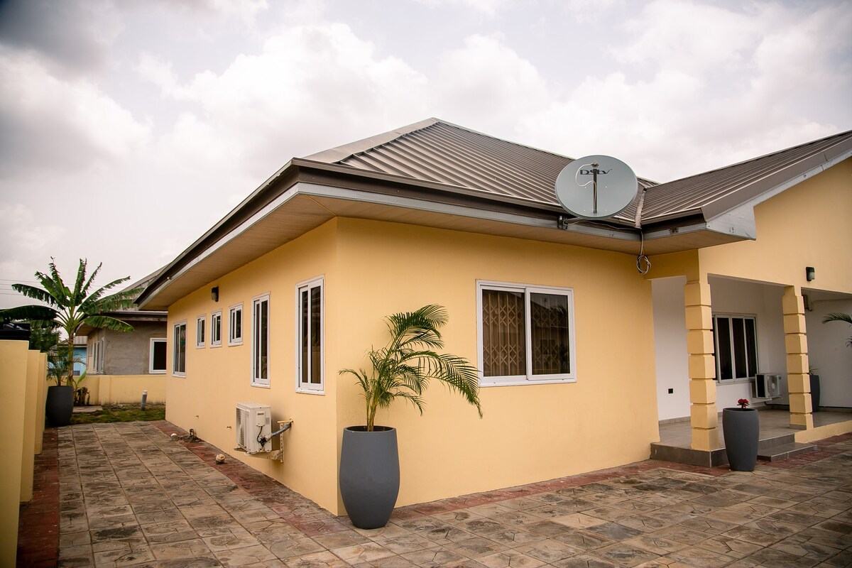 Détendez-vous en famille dans ce logement paisible. Notre établissement est idéalement situé à Community 26, Tema, au large de la N1 (Extension d'autoroute), derrière Community 25 Palace Mall . Le quartier dispose d'un large éventail de magasins, de restaurants et de services accessibles à pied. Chacune des huit unités est entièrement meublée et équipée de trois unités de climatisation LG, d'une machine à laver, d'appareils en acier inoxydable, de trois ventilateurs, de lits king size confortables, ainsi que d'ustensiles de cuisine et de salle à manger. Parking gratuit.