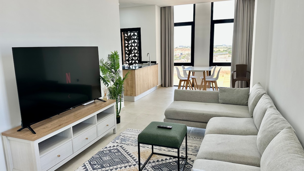Elite 1 bedroom Apartment in Muscat Bay!exclusive beachfront gated compound. - Direct Access to a Private Beach -Resort-Style Swimming Pool + a vibrant kids’ play area -Cinematic Experience, largest smart TV. -Top-Tier kitchen Appliances in home— outdoor BBQ area. -Dedicated Car parking lot -Fast Wi-Fi -large balcoby with Pool and green view -multi capsule coffee machine -washing machine -super market delivery and cleaners on call