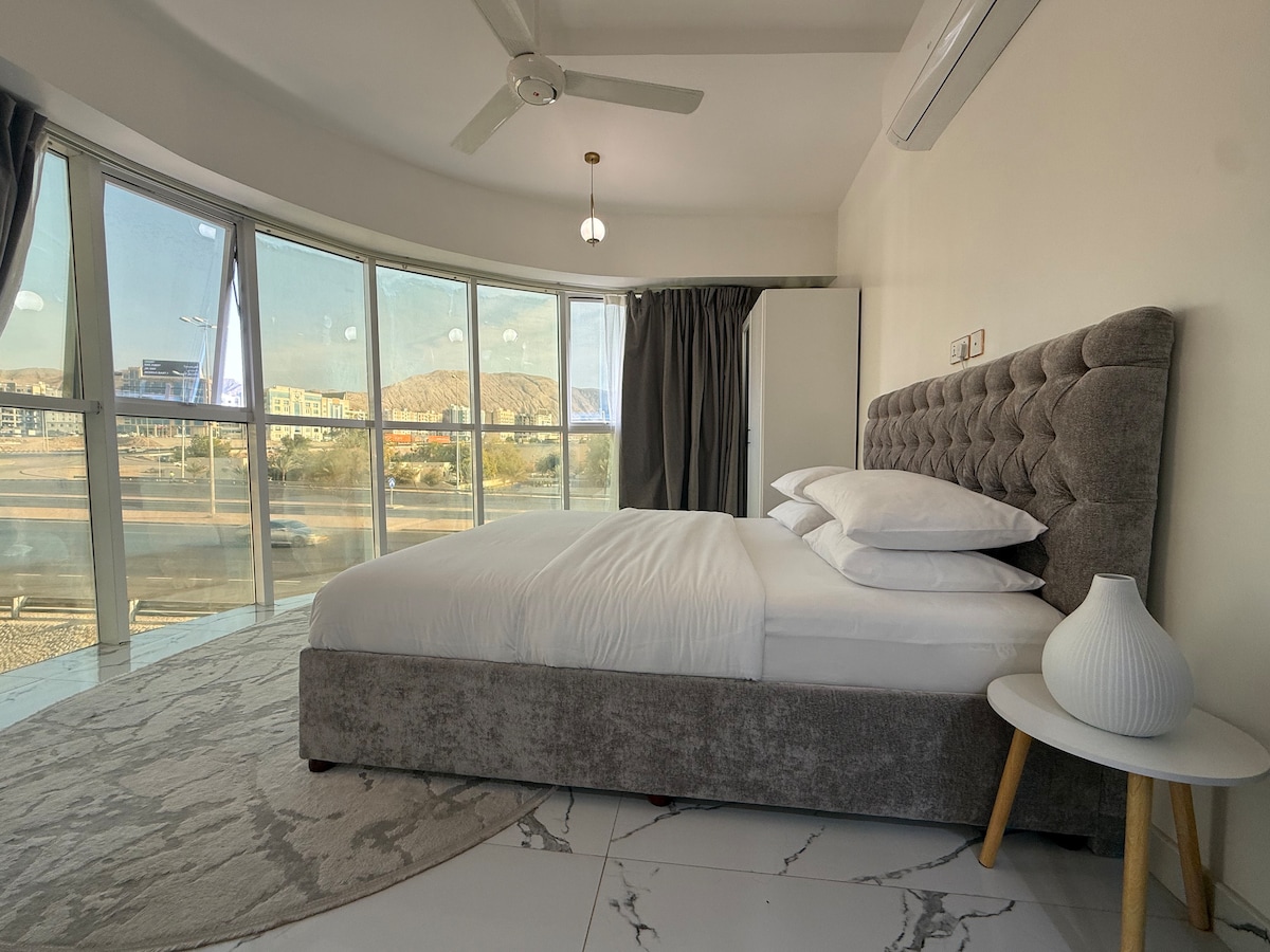 Ce penthouse unique d'une chambre est idéalement situé sur le Muscat\ Al Mouj, avec une vue imprenable sur la mer. ——L'espace—— Calme, propre et paisible avec des meubles neufs et modernes, il est parfait pour la détente et le plaisir. Piscines, salle de sport, aire de jeux pour enfants, accès à la plage, marina, cafés et restaurants à l'intérieur et à l'extérieur du bâtiment\ zone. Détendez-vous complètement avec des équipements haut de gamme (salle de sport, piscine, télévision 80”, WiFi 5G, draps et serviettes de qualité, et plus encore) à portée de main !