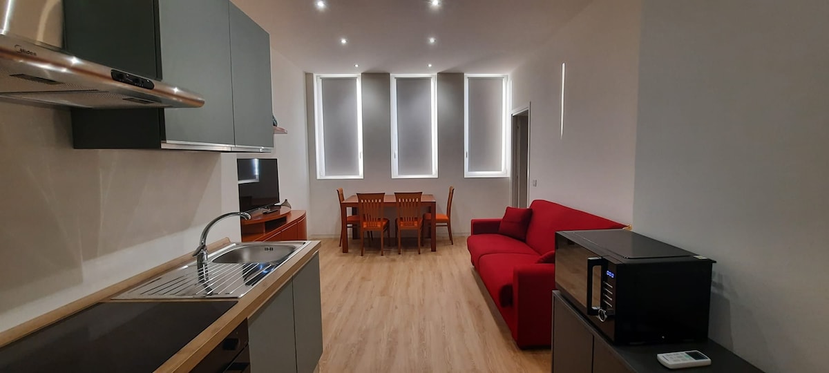 Appartement tout neuf, charmant et calme, avec terrasse privée et parking réservé. Une chambre, un salon avec canapé-lit double et une salle de bain. Cuisine entièrement équipée, climatisation dans chaque chambre et Wi-Fi ultra-rapide • Situé à environ 2 minutes à pied de l'arrêt de TRAM n° 24, qui mène directement à la vieille ville (Duomo). À 2 minutes à pied du marché LIDL. Jardin privé avec canapés et ensemble de café, WiFi rapide, Netflix, parking, jardin inclus ✓