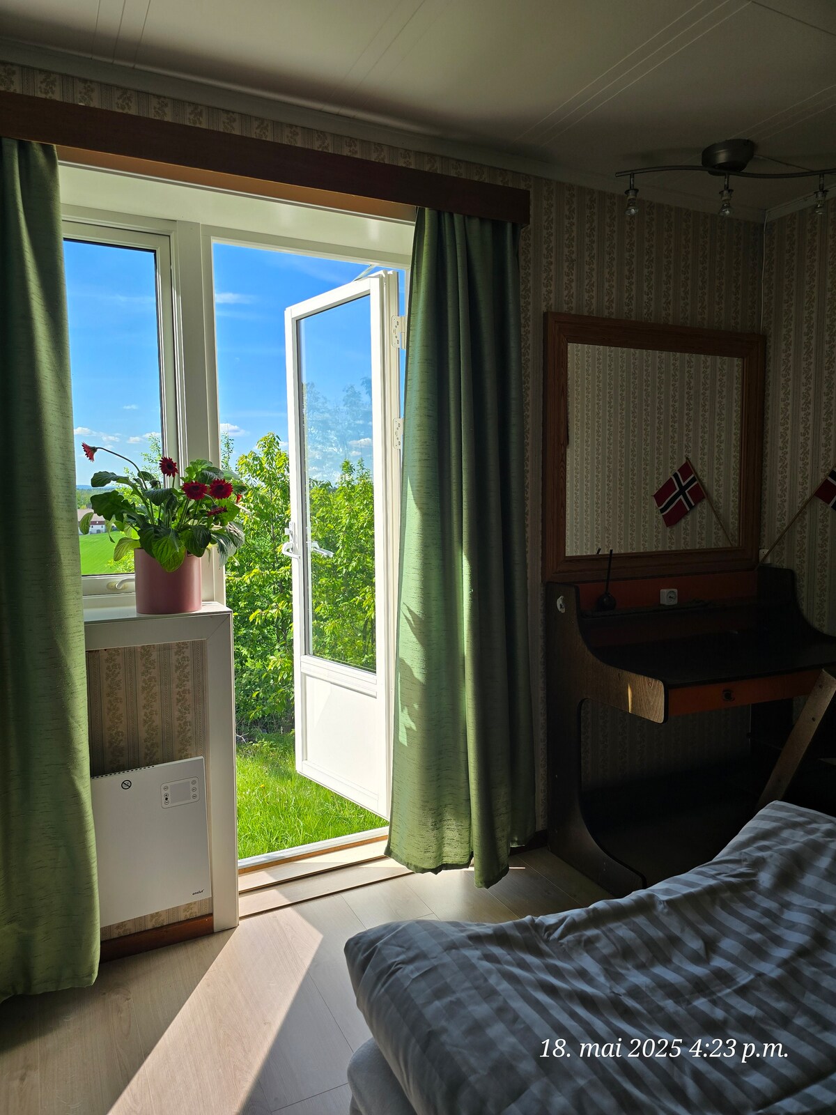 Welcome to historic Knatten — a peaceful, green oasis with panoramic views of the Oslo Fjord, centrally located in the heart of Horten - just a few minutes’ walk from the city center and beaches. Stay in a pleasant guesthouse — a large, private room (30 m²) — featuring a luxurious continental bed, sofa, and dining table. The guesthouse has no running water, but you’ll have full access to my well-equipped, kitchen and bathroom in the main house. Free fiber Wi-Fi. Free private parking.