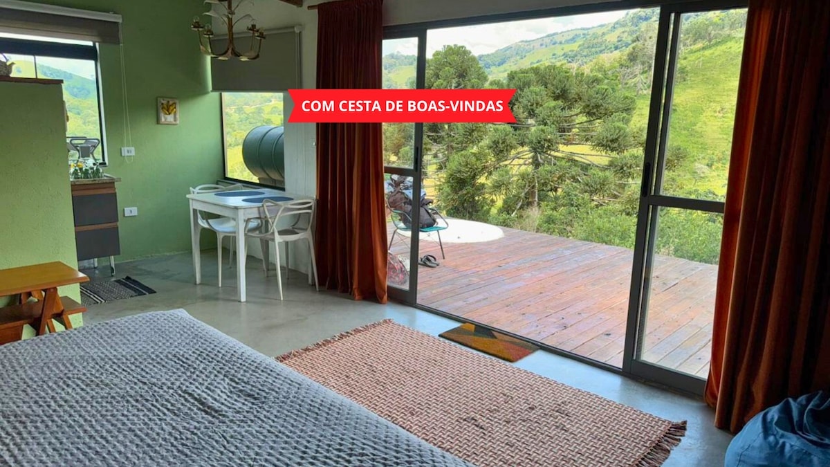 Découvrez la magie de la Serra da Mantiqueira dans cette cabane conçue pour que vous puissiez contempler le lever du soleil sans quitter votre lit. Venez vous détendre dans notre spa chauffé, regarder les étoiles dans le hamac et la balançoire. La cabane dispose d'une chambre intégrée avec un lit Queen Size confortable. Dans le salon/cuisine, un futon super confortable peut accueillir deux personnes de plus, ce qui en fait une expérience idéale pour les familles. La propriété dispose également de sentiers et de petites chutes d'eau. Ce site est un refuge unique.