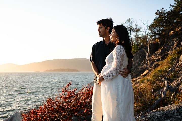 Visitez le parc du Phare à West Vancouver pour des couchers de soleil époustouflants et des photos de paysages emblématiques de Vancouver. Nous emprunterons des sentiers à travers des forêts anciennes pour atteindre les rochers géants qui surplombent l'océan Pacifique. Cette séance implique de marcher sur des sentiers. Elle est idéale pour les couples qui souhaitent capturer leur amour et leur complicité dans le cadre magnifique du Nord-Ouest Pacifique.