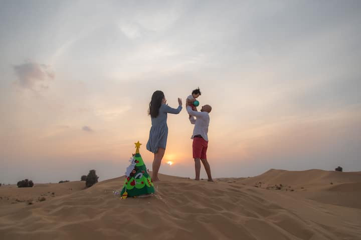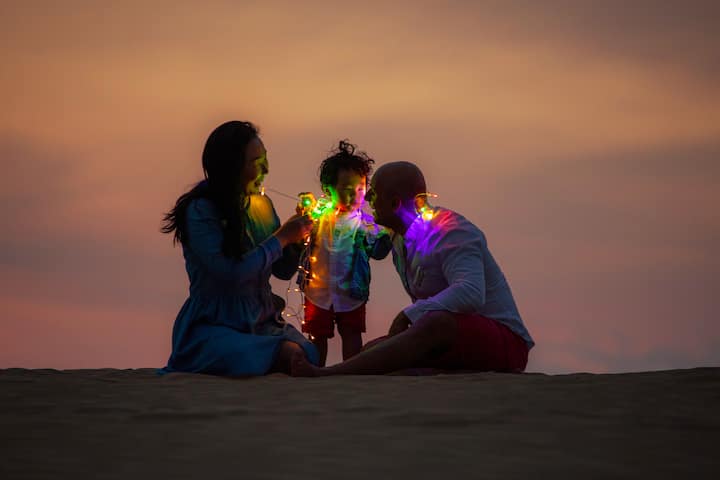 Portrait d'un couple et de leur enfant dans un lieu de votre choix ou sur ma suggestion, incluant 30 photos retouchées, pour une durée d'une heure et demie, au moment de votre choix : au coucher du soleil ou même au lever du soleil.