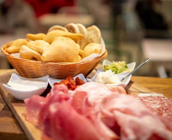 Cet assortiment d’aliments traditionnels pour 2 personnes comprend 10 gnocchis frits, des tigelles et une sélection de charcuteries émiliennes avec des fromages typiques à assortir. C'est l'option idéale pour une expérience de dégustation complète mettant en valeur les saveurs emblématiques de la région.