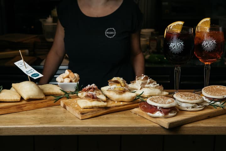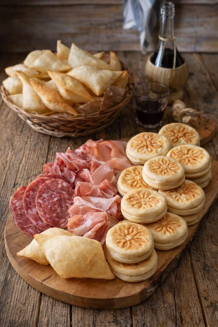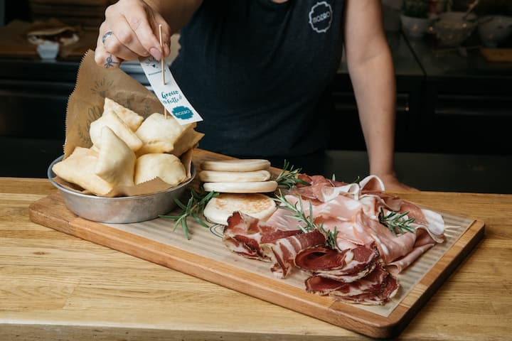 Ce menu équivaut à un déjeuner ou un dîner déjà prêt. Les spécialités comprennent 10 gnocchis frits, 8 tigelle traditionnelles, une planche de charcuterie locale avec des fromages locaux et des sauces émiliennes typiques, comme le pesto de Modène et la crème de lard. Le tout est accompagné d’une bouteille de Lambrusco, le vin pétillant par excellence de l’Émilie-Romagne.