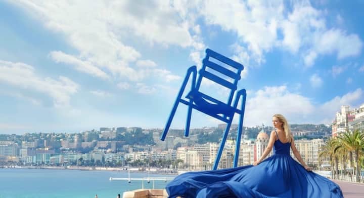 Photoshoot : courir avee unne robe volante sur la promenade des anglais devant le fameux Negresco à Nice