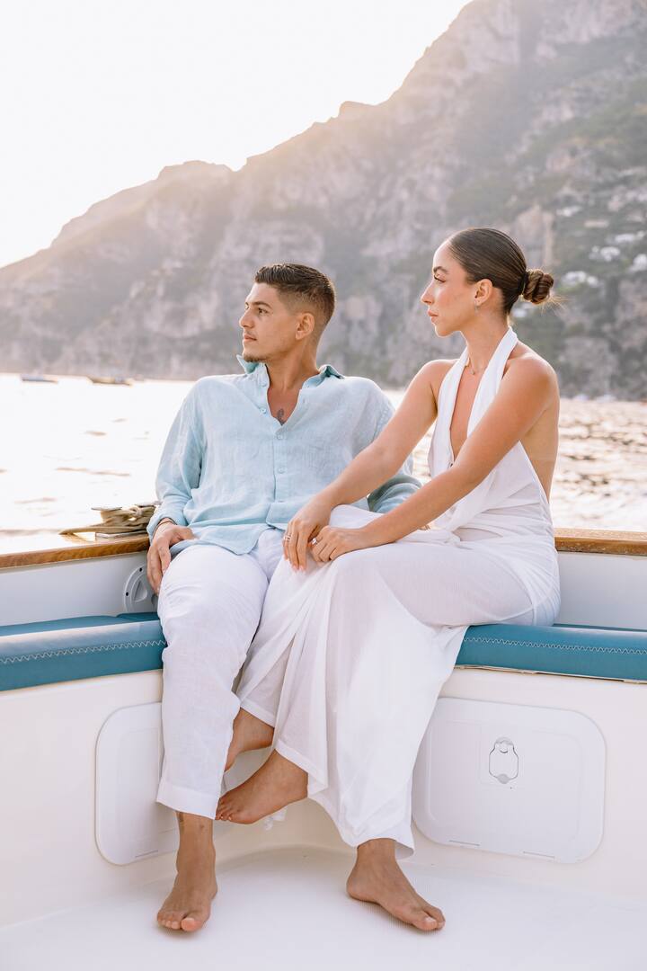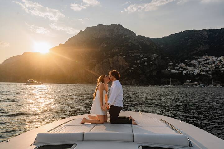 Séance photo avec excursion en bateau au coucher du soleil d'une durée de 90 minutes pour capturer les images les plus spectaculaires de la côte amalfitaine. Avec départ de Positano ou d'Amalfi et différentes possibilités d'itinéraire. 100 photos livrées