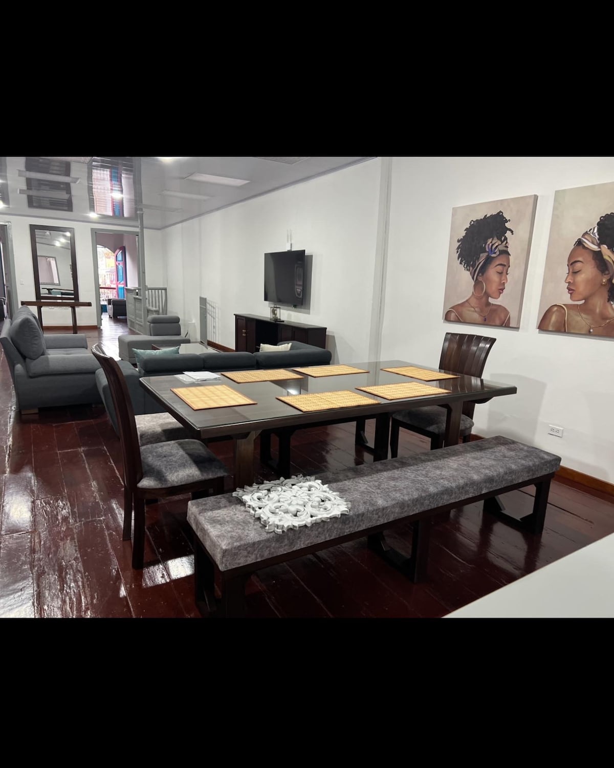 Appartement confortable dans le centre de Séville, Valle del Cauca. Il dispose de 4 chambres (une avec salle de bain privée), salle de bain générale, cuisine équipée, salon avec télévision et Wi-Fi, salle à manger et cour. Situé à quelques pas du parc central, de la basilique Menor, et d'une rue piétonne avec de nombreux cafés et restaurants. Idéal pour profiter de la culture locale et d'un séjour confortable.