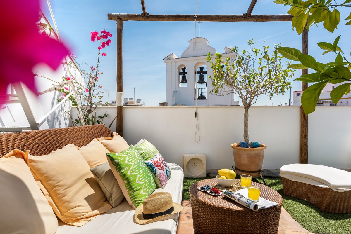 Incroyable penthouse avec ascenseur pour un maximum de 3 personnes, avec 2 terrasses privées à l'usage exclusif de cet appartement, la plus haute terrasse avec vue panoramique sur toute la ville, vous pouvez voir plus de 15 tours historiques du centre historique, y compris la Giralda de la cathédrale de Séville au loin. Il est très exclusif et original et a été conceptualisé avec un style moderne mais sans perdre l'essence d'antan, et équipé de tout le confort et des détails pour les clients.
