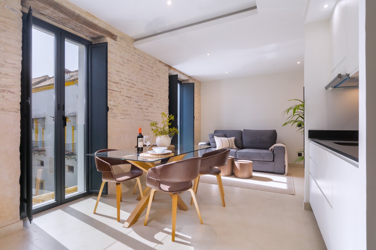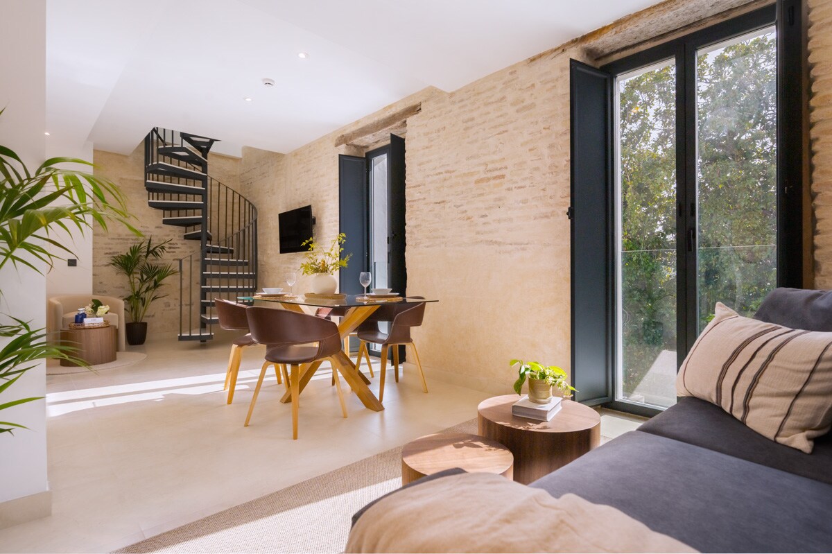 Appartement équipé du chauffage/de la climatisation. Spacieux, confortable et parfait pour l'été à Séville. Il est construit dans une ancienne maison-palais entièrement restaurée et conserve un mur extérieur de 1 mètre de large qui isole de la chaleur et du bruit. Idéal si ce que vous voulez, c'est être à l'aise pendant votre voyage et vivre comme si vous étiez un Sévillan.