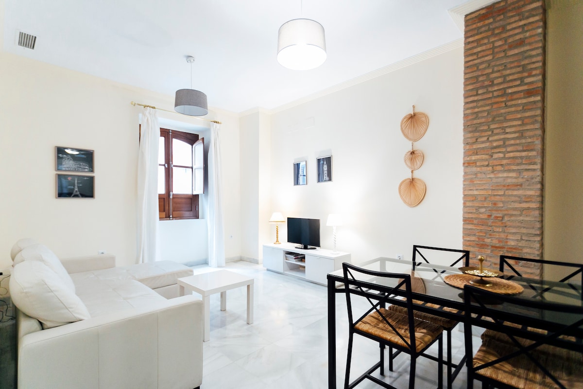Logement situé dans le centre de Séville. Vous allez adorer l'appartement grâce à sa hauteur de plafond, l'espace accueillant, les lits confortables, la cuisine... Notre logement s'adresse aux couples, aux familles avec enfants, aux amis, aux voyages d'affaires... Piscine ouverte toute l'année, à partager avec 4 autres appartements. Possibilité de se baigner lorsque le temps le permet (non chauffée)!
