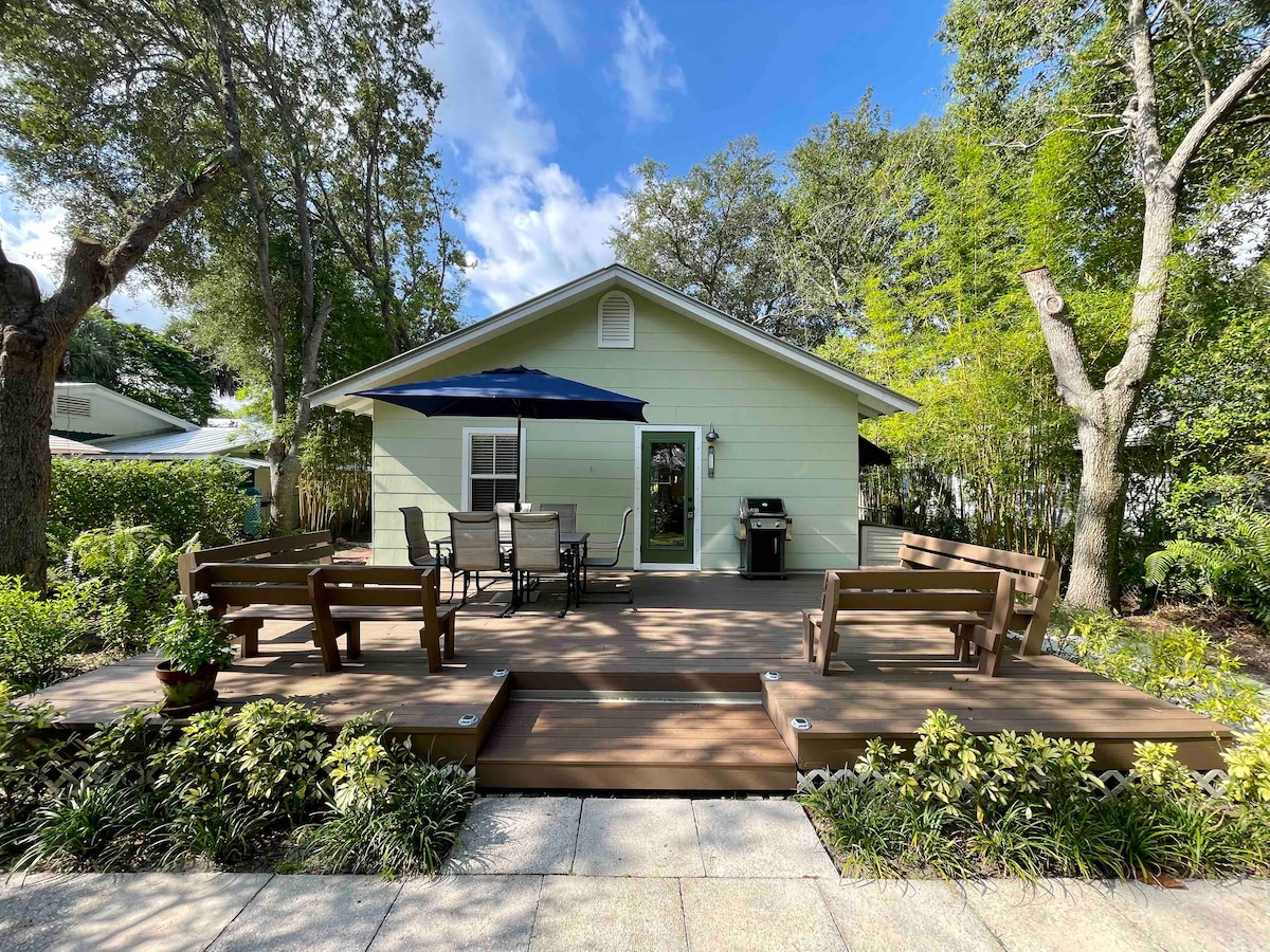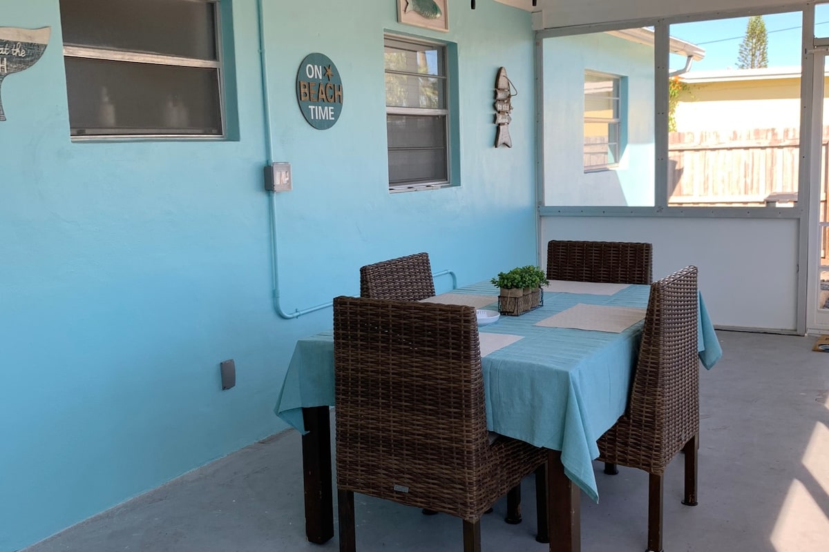 Bienvenue à Green Turtle A. Située à moins d'un mile du magnifique centre-ville de Stuart, cette maison confortable, mais très spacieuse, de 2 chambres et 1 salle de bain peut accueillir 7 personnes, avec un lit King Size, des lits jumeaux superposés Queen Size et un canapé-lit. Le porche avant fermé dispose d'une table pour 4 personnes pour profiter d'un café ou d'un jeu de cartes ainsi que d'un espace de bureau dédié. Grande cuisine fonctionnelle avec salle à manger pour 6 personnes. Le porche arrière dispose d'une table à manger pour 6 personnes et d'une cour clôturée pour garder vos petits humains ou chiens en sécurité. Buanderie sur place. Pas de chats.