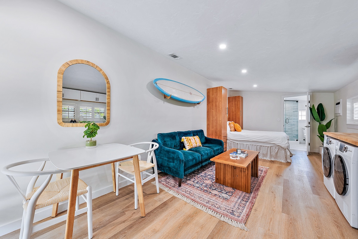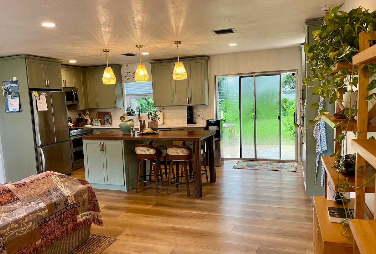 Bienvenue au Sunny Boho Beach Studio, votre escapade sereine à Stuart, en Floride ! Ce studio paisible dans un duplex offre de l'intimité, ne partageant qu'un mur avec une unité adjacente. Vous n'êtes qu'à quelques minutes à vélo du centre-ville animé de Stuart avec de nombreux excellents restaurants. Profitez d'une cuisine complète, d'un coin repas et d'un salon confortables, ainsi que d'un lave-linge/sèche-linge compact pour plus de commodité. Détendez-vous dans une salle de bain magnifiquement rénovée. Veuillez noter que vous n'avez PAS accès à la piscine avec ce logement.