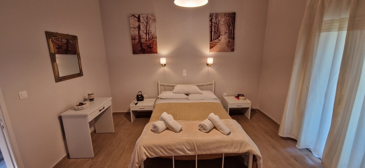 Rita's Home is brand new, tastefully furnished, 53m² , upper-floor apartment for 5 person. Only 50 meters from Acharavi's sandy and pebbly beach, where you'll find restaurants, bars, and also sunbeds are available. Ideal for 4 adults or 4 adults and 2 children. The apartment has 2 separate bedrooms, 2 bathrooms, and a living room with a large sofa that opens into a double bed (150*200). Comfortable, high-quality mattresses. Well-equipped kitchen. Air conditioning in every room