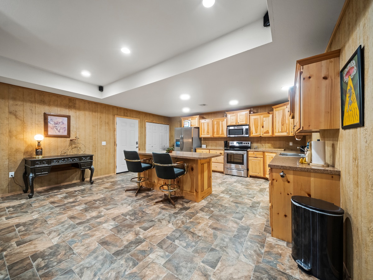 Beaucoup de places de stationnement : remorques, bateaux, voiturettes de golf acceptés ! Options de prise de courant disponibles sur demande. Ce logement est unique : des logements à l'intérieur d'un grand bâtiment métallique ! Wifi super rapide, impeccable et beaucoup d'espace pour s'étendre. En plein cœur de Poteau, restaurants et cafés accessibles à pied. Vous allez adorer « Grandma's Basement Vibes » !