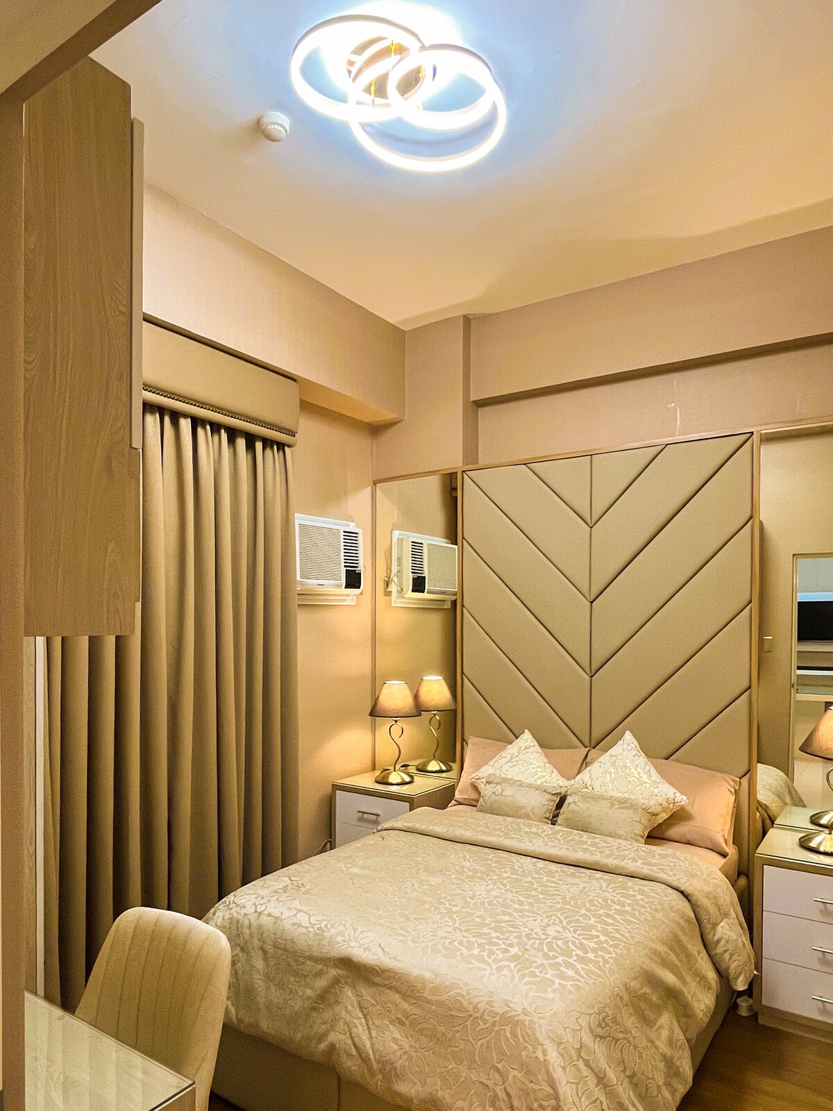 Bienvenue dans notre suite relaxante ! Profitez du grand hall inspiré du complexe hôtelier à votre arrivée et admirez notre vue spectaculaire la nuit sur le toit-terrasse. Ce condo de deux chambres a été entièrement conçu pour s'adapter parfaitement à son cadre urbain. Un endroit dont vous avez besoin pour votre voyage d'affaires, vos vacances sédentaires ou un endroit idéal pour des voyages plus longs dans le Grand Manille. Viera Residences assure l'accessibilité à certains endroits comme le centre commercial, les soins de santé et la vie nocturne dans les quartiers de Timog ou Tomas Morato.