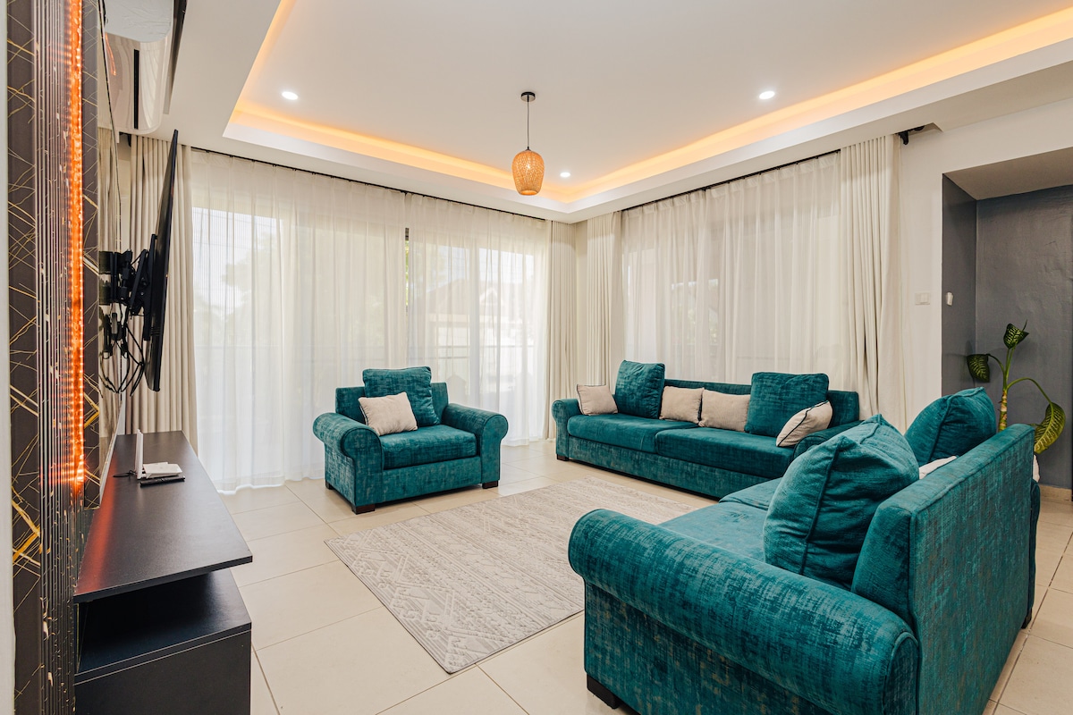 Bienvenue à WhiteHouse Mtwapa, un domaine moderne, entièrement meublé et luxueux à l'intérieur de The Shamba sur la côte de Mtwapa, au Kenya. Louez la section 4-BR, idéale pour les familles, les groupes et les longs séjours. À quelques minutes de la plage, à 15 minutes du centre commercial Nyali et à proximité du restaurant Moorings. Profitez d'une vue imprenable sur la végétation et la piscine, de plusieurs salons, d'une salle de sport, d'une salle de prière et d'une cuisine entièrement équipée, parfaite pour cuisiner en groupe et pour les retraites.