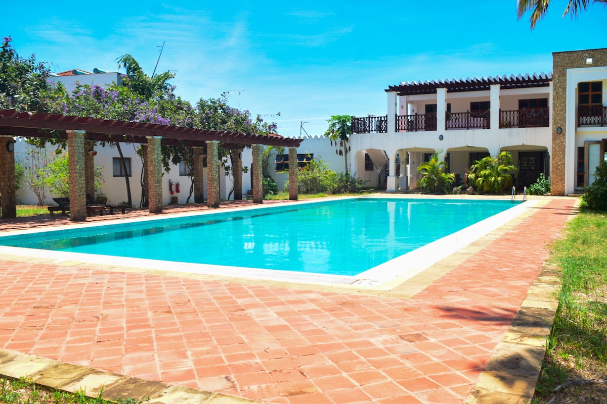 You will enjoy easy access to everything from this centrally located place. Easy access to the beach, eating spots, multiple restaurants, top beach hotels including Serena, Flamingo and Pride Inn, a serviced swimming pool and elevator. 15 minute drive to Nyali center. Tastefully decorated apartment in a quiet serene neighborhood with modern amenities and cleaning services.