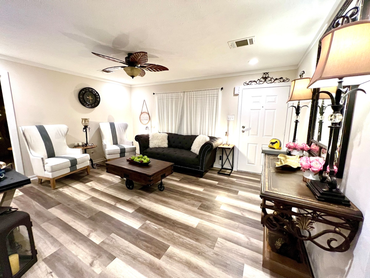 Bienvenue au Majestic River Garden. Ce charmant chalet a été construit en 1945 avant cette époque de maisons plus mignonnes à biscuits où chaque maison du quartier se ressemble. La maison se trouve à l'un des points d'altitude les plus élevés de Floridas, à 40 pieds au-dessus du niveau de la mer, ce qui vous offre une vue incroyable sur la rivière Indian. Si vous regardez par-dessus la ligne de toit voisine, vous pouvez repérer le bâtiment VAB de la NASA. La maison a un charme original, mais dispose d'un plancher en bois de céramique moderne et rénové et d'une cuisine moderne rénovée.
