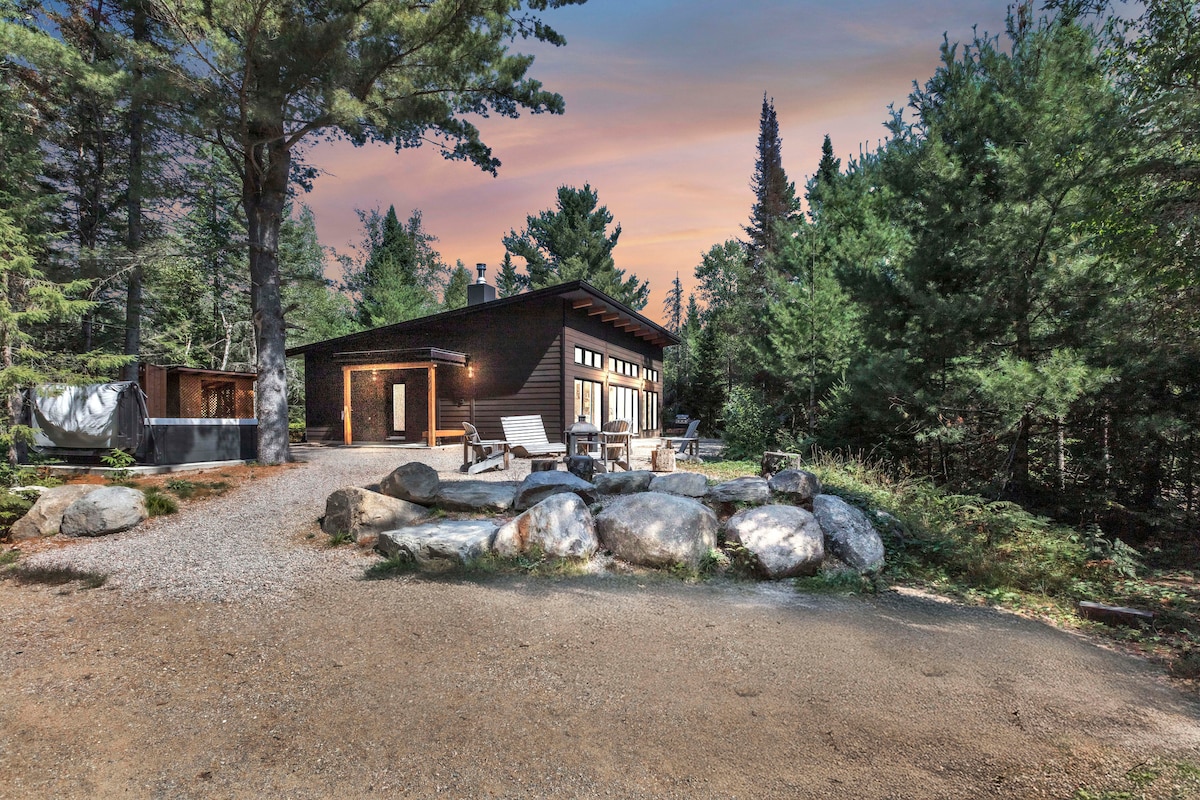 Cozy yet modern log cabin right on the Rivière-aux-Écorces. Hear the peaceful sound of the rapids while enjoying the hot tub, sauna and outdoor eating area, or nestle up by the wood fireplace indoors. A true home away from home! Chalet moderne sur la Rivière-aux-Écorces. Vous entendrez le magnifique sond des rapides en profitant du spa et le coin rapas extérieur. Sinon, vous apprécirez le foyer au bois à l'intérieur. Cachet unique!