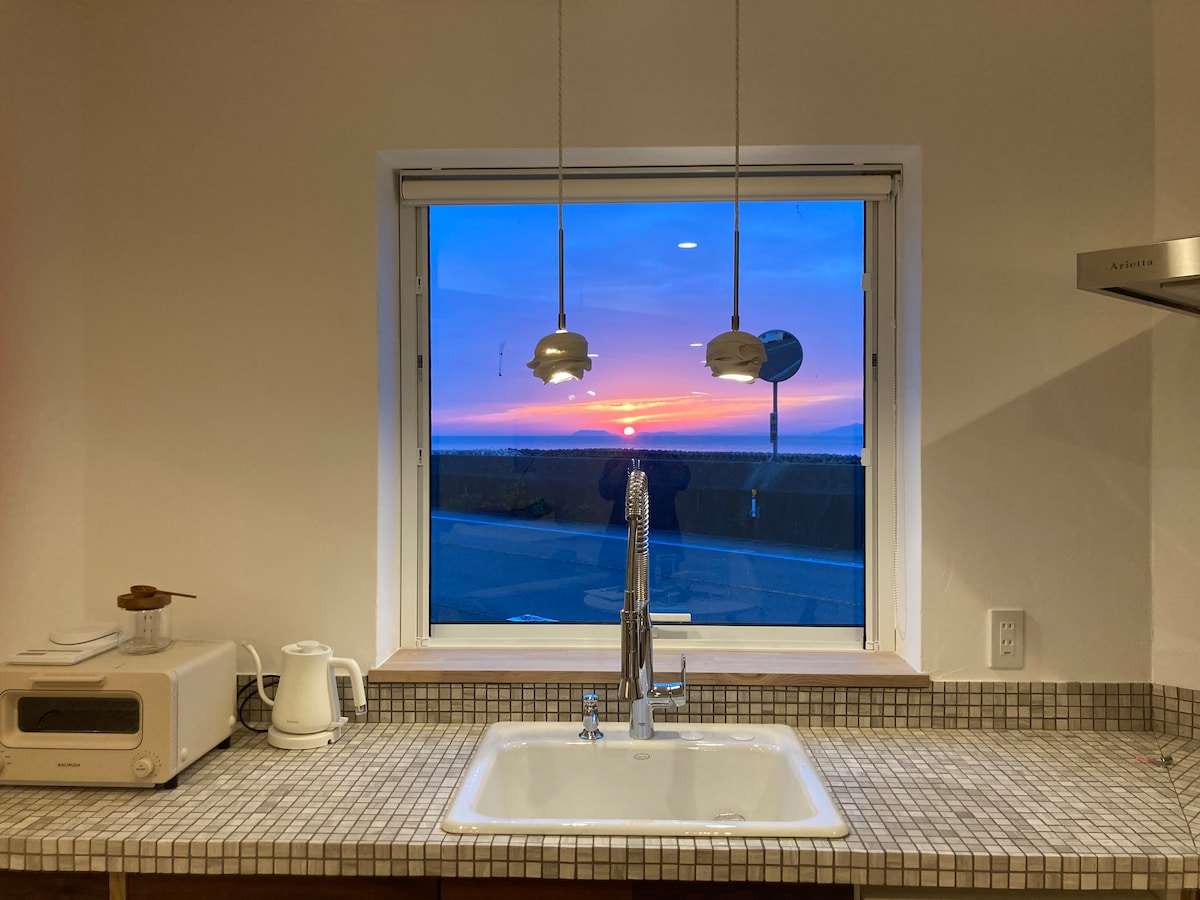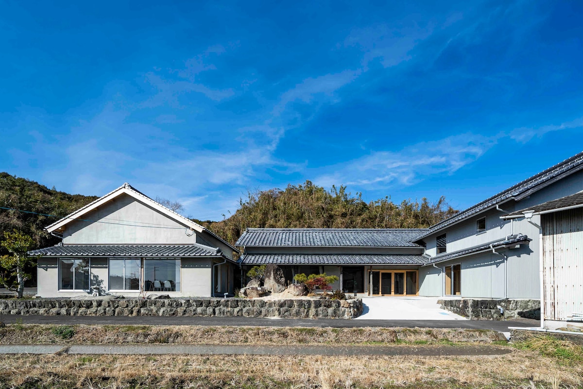 Une maison d'hôtes privée, limitée à un groupe par jour, est ouverte le long de la côte près de la gare de Shimonada, dans la ville d'Iyo, dans la préfecture d'Ehime. Le ciel et la mer s'étendent à perte de vue, d'un bleu clair et magnifique. Un espace apaisant à base de plâtre. Vous pouvez voir la mer intérieure de Seto au premier étage, face à la mer, et vous pouvez cuisiner dans une cuisine élégante tout en regardant le coucher du soleil. Au deuxième étage, vous pourrez regarder le coucher de soleil sur la terrasse et créer. Il y a un lit queen size. Il y a un canapé-lit Koala qui se transforme en lit queen size. Il y a un lit double au deuxième étage. Il peut accueillir jusqu'à 4 personnes. Le pain au levain naturel du petit-déjeuner et le café Rodan sont inclus. La vaisselle est l'œuvre du céramiste Tomoya Sasaki, originaire de la préfecture d'Ehime, et nous utilisons Mustakibi et le four de Longquan. Les serviettes utilisées sont des serviettes Iori de la marque Imabari. Les draps sont en lin. Si vous avez besoin d'un dîner, vous pouvez l'utiliser uniquement pour les clients du restaurant Shioji adjacent. Le transfert à la gare est gratuit. Nous vous offrons un moment merveilleux et riche en souvenirs. Profitez d'une villa avec une vue imprenable sur Setouchi, sans précédent.