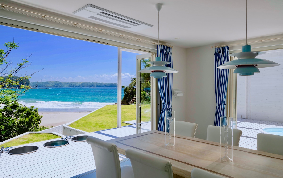 Maison scandinave spacieuse entourée de verdure. Le jardin et la terrasse sont en annexe. Une promenade de 5 minutes jusqu'à la plage d'Ohama. Vous pourrez profiter d'un barbecue dans le jardin. Il y a une serviette de visage, une serviette de bain, une brosse à dents, du toner, etc. Nous vous fournissons un parasol, une body board, une luge pour le ski de sable, des chaises extérieures, une glacière, un lit pour bébé. À 5 minutes en voiture de la maison à la grotte de Ryugu et au spot de ski de Geo !