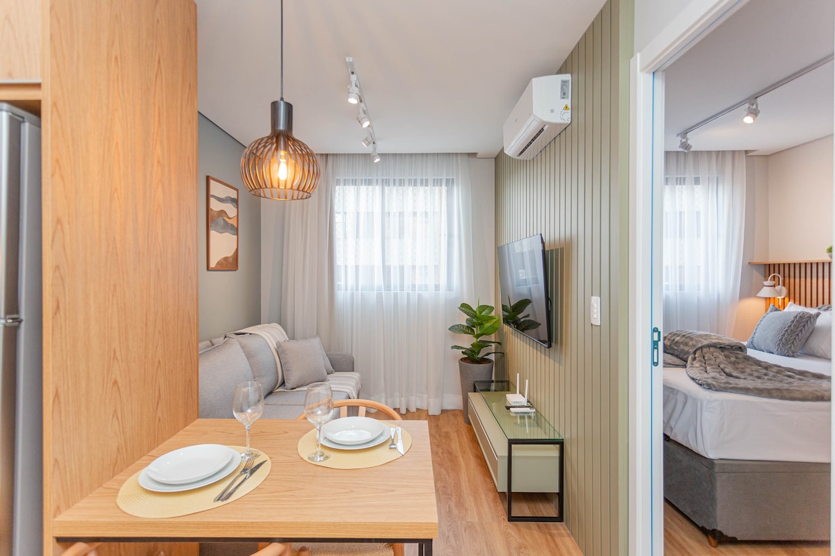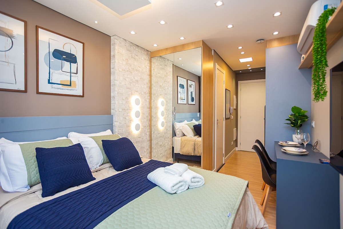 Studio moderne et raffiné au cœur de Curitiba, idéal pour 3 personnes maximum. Profitez d'un logement entièrement équipé avec une cuisine approvisionnée, le Wi-Fi haut débit et la climatisation. L'immeuble propose une salle de sport, un espace de coworking et un rooftop avec une vue imprenable. Parfait pour les affaires ou les loisirs, avec tout ce dont vous avez besoin pour passer un séjour inoubliable dans la capitale du Paraná.