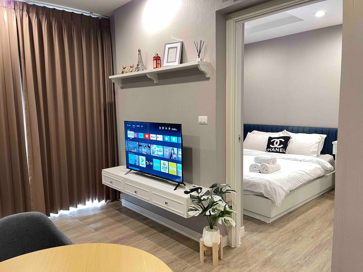Ce logement exclusif se trouve au cœur de la ville de Bangsaen. Excellent emplacement. Facile de se déplacer. Il est facile de planifier n'importe quel voyage. La chambre est joliment décorée, bien équipée, confortable. Le toit-terrasse est une salle de sport commune et une piscine. Le système de débordement avec vue sur la mer est parfait pour une véritable escapade. Vous pouvez nager ou monter pour voir la vue.