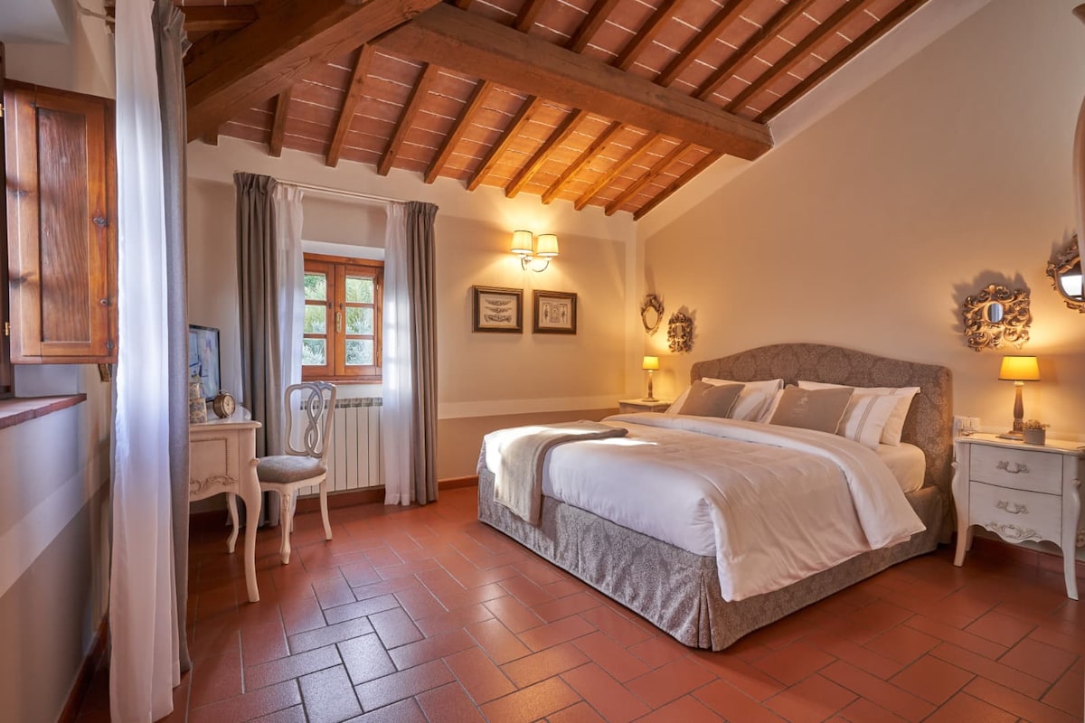 Perched on a hillside above the Valdarno area, between the cities of Florence, Arezzo and Siena, the Lazy Oak villa is surrounded by acres of olive groves. The main house on two level has been fitted with bedrooms, bathrooms and new kitchen whilst retaining its old terracotta floors and beamed ceilings. A dining loggia for al fresco meals enjoys a breathtaking view of the countryside. The infinity pool is set just a few steps from the house on a green terrace furnished with loungers.