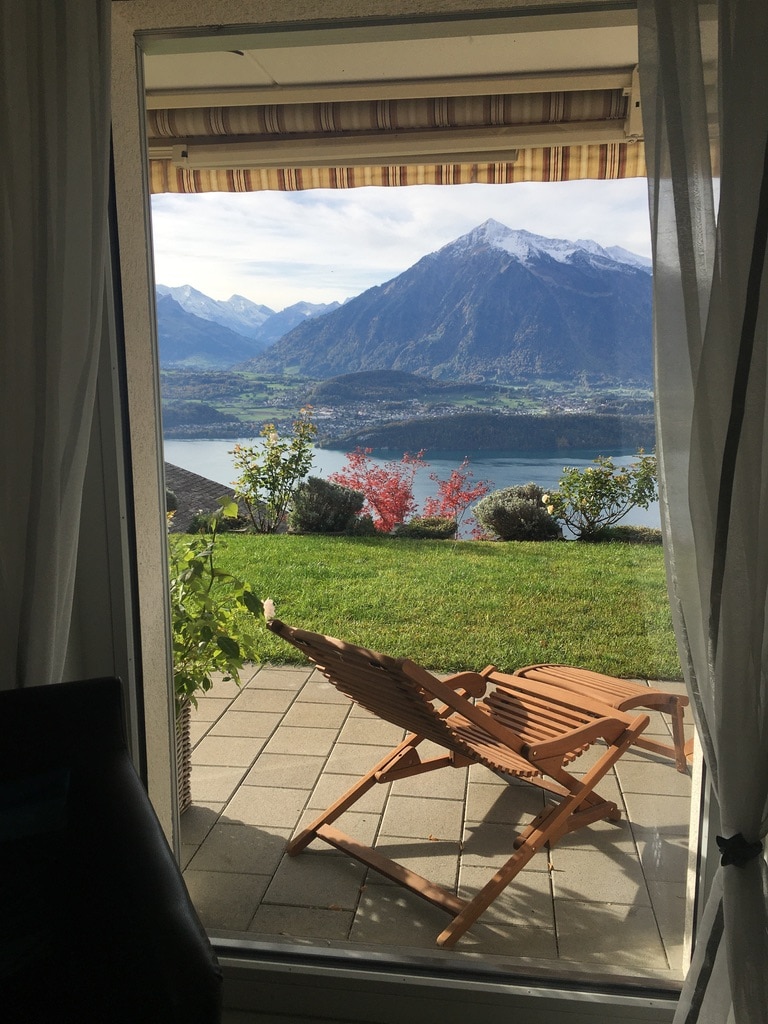 Chalet avec vue splendide sur les montagnes suisse et lac de Thoune à environ 900 mètres d'altitude dans la région de l'Oberland bernois Un jardin clos et 2 grande terrasse panoramique 1 haute ou vous pouvez manger faire manger faire un barbecue, prendre votre petit déjeuner, dîner en admirant la splendide vue ainsi qu'à l'intérieur dans la salle à manger au niveau de la chambre ou vous pourrez profiter de chaise longues et d'un whirlpool avec musique