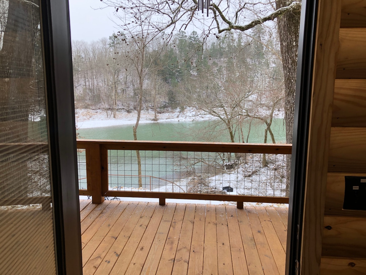 Construit en 2018, salle de bain intérieure rénovée en 2023. Chalet studio. Lit King Size, lits superposés adultes, grand canapé en cuir, grande terrasse couverte, balançoire, grillades, trempage. Bel endroit pour se détendre, se baigner, flotter ou explorer. Entouré d'arbres/de cerfs. Sentiers de randonnée Nous avons des cabanes Collier & Caddo. Le plus joli ruisseau ! Cristallin et frais. Pas de frais pour les chiens ! Parquet, longue distance gratuite, patio donnant sur le ruisseau ! Wifi et directtv. Arbres, cerfs et bonus entièrement plomberie Out house ! Veuillez rester sur notre propriété et notre ruisseau !