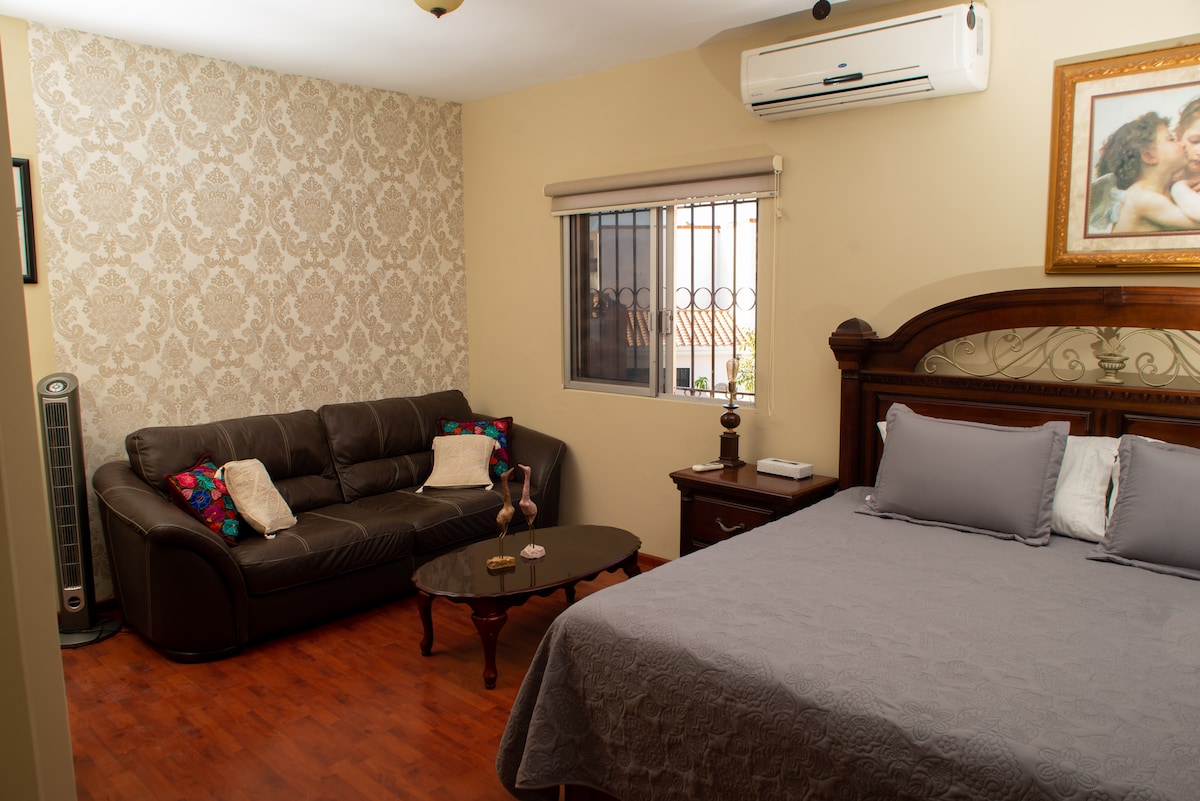 C'est un petit espace, confortable équipé avec ce qu'il faut pour les voyages d'affaires ou les vacances, entièrement accessible à tous les besoins, il dispose de services de différents types de nourriture autour. À 10 min de l'aéroport, la centrale de camions, le palais du gouvernement et les places commerciales, est très central.