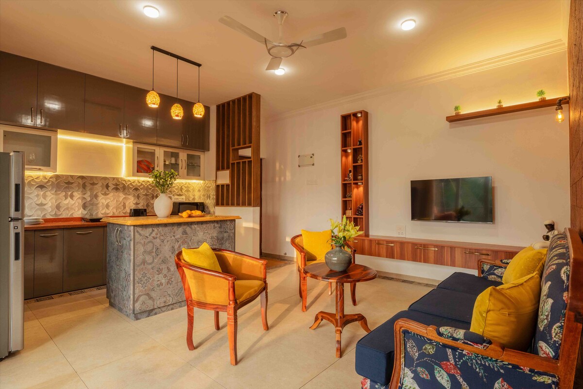 Imaginez entrer dans un appartement moderne et soigneusement conçu avec des jardins de balcon comestibles luxuriants que vous partagez avec des oiseaux et des écureuils. Situé à Siolim Marna, ce 1BHK est conçu pour les couples, les voyageurs en solo et les familles décalées pour de courtes vacances, un workation plus long ou une retraite paisible. Nous aimons tout ce qui concerne le design et le bricolage. Chaque meuble a été recyclé et nous avons essayé de penser à tout ce dont vous pourriez avoir besoin : Wi-Fi de secours, bar, cuisine équipée, balançoire, livres et fournitures artistiques !