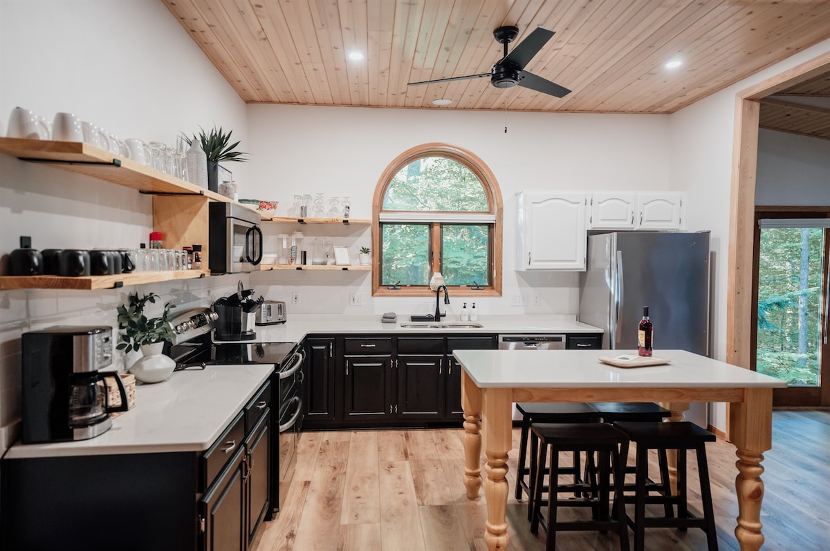 Chalet moderne en forme de A, Sister Bay, bar à café, cheminée