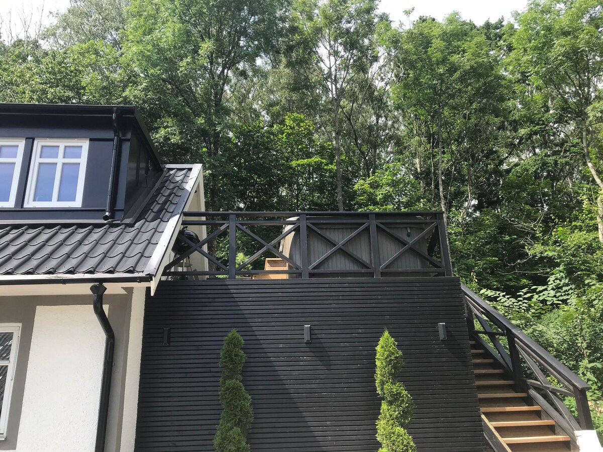 Modernt gästhus i lummig skogsträdgård